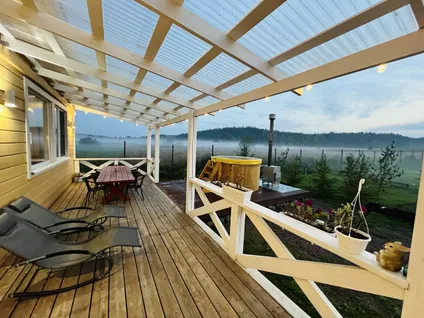 Дом 100 кв.м. c большой террасой, русской баней на дровах внутри.С комфортом до 10 человек. Купель-джакузи.