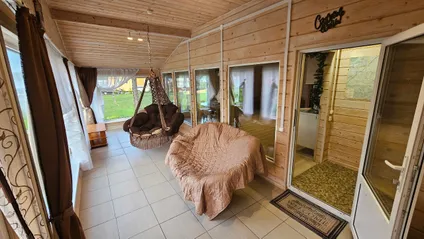 Уютный домик 45 кв.м, с большими панорамными окнами ,в котором с комфортом резмещаются до 4-6 человек. Финская сауна внутри.Уютная беседка с мангальной зоной, столом и плетеной мебелью.
